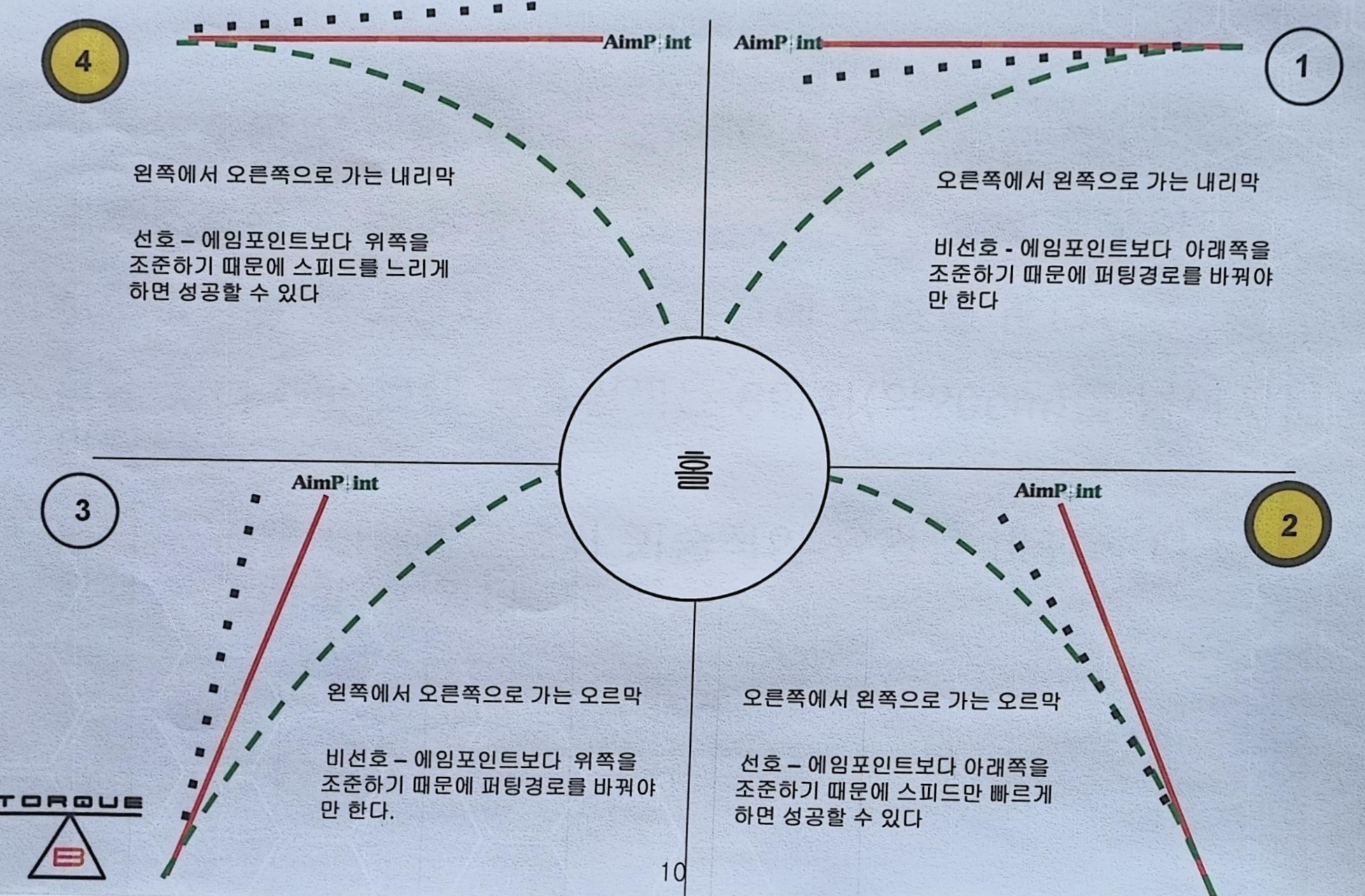 반대로 내리막 퍼팅은 훅라인이 어렵고 슬라이스 라인이 더 쉽지만 자기혼자 슬라이스 라인이 쉽다 하기도 뭐하고 해서 그냥 입다물고 있는 경우가 있는데 실제로 왼쪽 에이밍의 골퍼는 내리막 퍼팅에서 슬라이스 라인이 더 쉽게 됩니다. 이는 조준 라인을 다시 설정하지 않고 그냥 속도만 조금 느리게 퍼팅을 하면 들어가기 때문입니다.